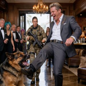 Kaiser hit the first fake caterer like a guided missile—eighty-five pounds of retired Navy SEAL Multi-Purpose Canine slamming into the man’s chest at full sprint. Teeth found throat. The submachine gun clattered across the marble floor as the mercenary went down screaming.