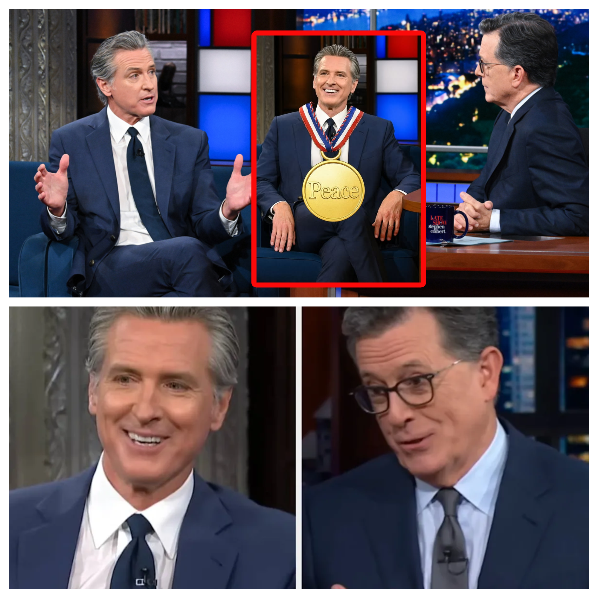 In a segment that blurred the line between late-night satire and full-blown fever dream, California Governor Gavin Newsom strutted onto The Late Show with Stephen Colbert last night, December 6, 2025, clutching a shimmering, laser-etched plaque that read: “The First-Ever Intergalactic ‘Most Peaceful Person in the History of the Earth’ Peace Prize.” “Stephen, I’m here to announce – with all the humility of a man who’s tamed wildfires, homelessness, and now… extraterrestrial envoys… that I’ve won,” Newsom deadpanned, his trademark megawatt smile cracking into a grin as Colbert’s studio band erupted into a cosmic synth riff. What followed was 15 minutes of unhinged hilarity: Newsom unveiling “official” holo-grams from the Andromeda Council, Trump’s alleged meltdown over the snub, and a viral moment that’s already spawned 10 million TikToks, #GavinFromTheStars memes, and a White House press secretary scrambling to deny alien interference in American politics. But beneath the absurdity? A razor-sharp jab at Nobel whispers, Newsom’s 2028 ambitions, and the absurdity of peace prizes in a world still reeling from Trump’s “peace through strength” era. If this is campaigning, the Golden State’s golden boy just beamed it straight to Alpha Centauri.