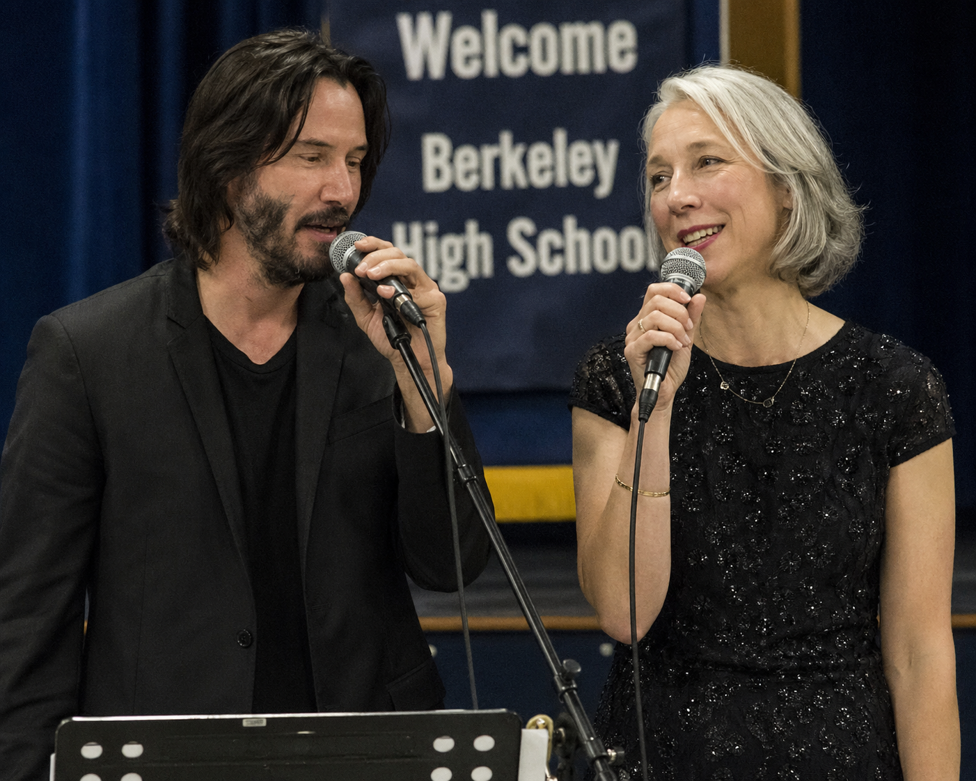 As they walked the familiar hallways lined with old photos and trophies, nostalgia filled the air. Students and staff gathered in the auditorium for what they thought would be a simple Q&A session. Instead, Reeves sat at an old upright piano — the same one he once played as a student — while Grant stood beside him with a microphone. Together, they performed a soulful acoustic rendition of a classic ballad, blending Reeves’ warm, understated vocals with Grant’s rich, expressive tone. Their harmonies were described as raw, imperfect, and profoundly moving, reflecting years of quiet love and artistic synergy.