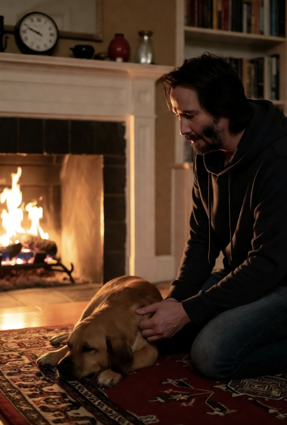 By dawn, Buddy’s breathing had stabilized. His tail gave a weak wag when Reeves stroked his head. The actor hadn’t slept. His eyes were red, his shirt stained with medicine and tears. But he smiled—small, private, real.