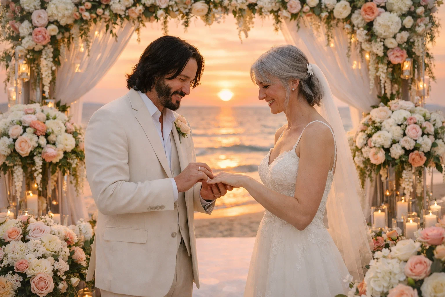 Now, at this stage in their journey, Keanu feels ready to celebrate their bond in a meaningful way. “I can finally provide the wedding she’s always dreamed of,” he reportedly shared, painting a picture of an intimate yet magical ceremony. Imagine vibrant blooms of fresh flowers everywhere — soft roses, delicate wildflowers, and elegant arrangements dancing in the gentle breeze. The setting would be perfect: a scenic location where the sky turns into a canvas of warm oranges and pinks as the sun dips below the horizon, casting a romantic golden light over the couple as they slip rings onto each other’s fingers and promise forever.
