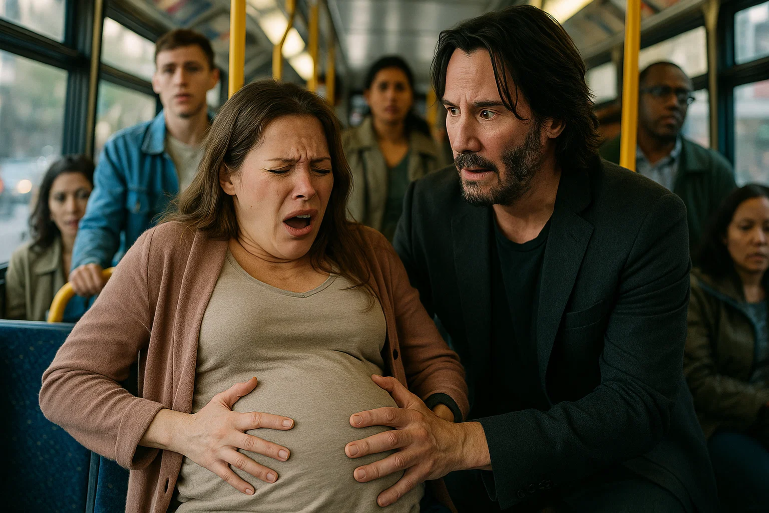 The incident unfolded on a bustling MTA bus weaving through downtown traffic. The woman, identified only as Maria—a 32-year-old single mother-to-be on her way to a prenatal checkup—clutched her belly in agony as contractions hit with ferocious intensity. Panic rippled through the vehicle; fellow riders froze, some fumbling for their phones, others whispering prayers. That’s when Reeves, seated quietly in the back with a worn paperback in hand, sprang into action. Dressed in his signature all-black attire and a nondescript beanie, he might have blended into the crowd, but his calm demeanor cut through the chaos like a beacon.