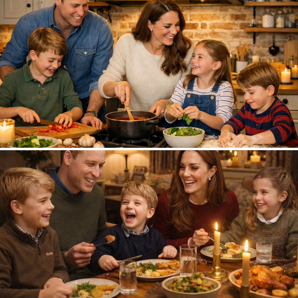 Instead of a formal royal banquet, the family chose something far more delightful: a hands-on family cooking session to mark half a year of settling into their new chapter. With aprons on and laughter filling the air, the children eagerly helped chop vegetables, stir sauces, and sneak tastes of the delicious dishes being prepared for dinner. Kate, known for her warm and down-to-earth approach to family life, guided everyone with gentle smiles and encouraging words, while William joined in the fun, playfully competing with the kids over who could flip the pancakes best or season the roast just right.