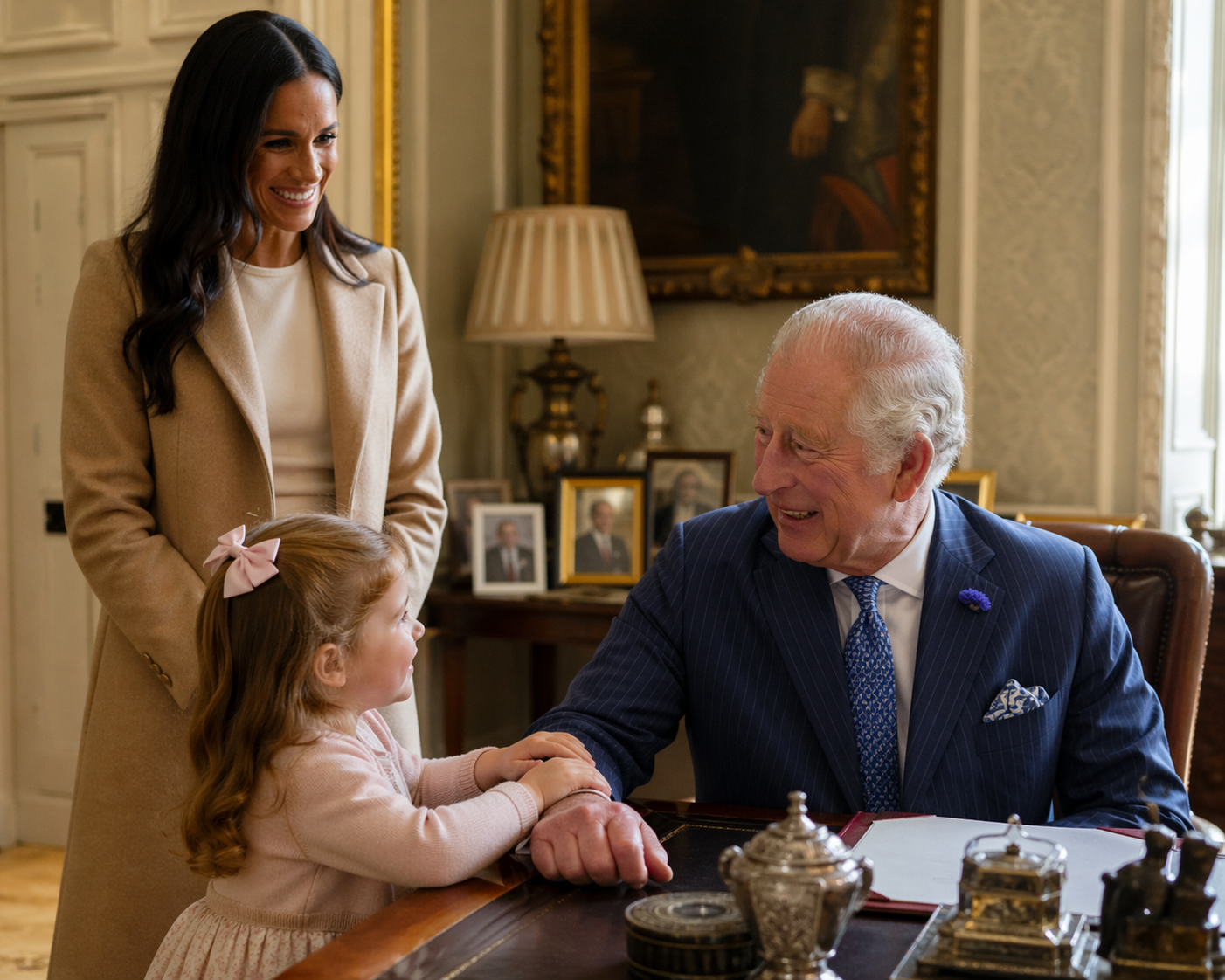 The photograph, which leaked online before being swiftly removed, captures a tender yet highly unusual scene: Meghan, dressed in elegant yet understated attire, gently guiding Lilibet through the ornate doors of the royal study. Inside, the young princess — with her signature red hair and bright curiosity — stands near the grand desk where generations of monarchs have conducted state business. King Charles, known for his love of gardening and quiet reflection, is said to have cleared his schedule for this intimate reunion, a moment long hoped for by those close to the family.