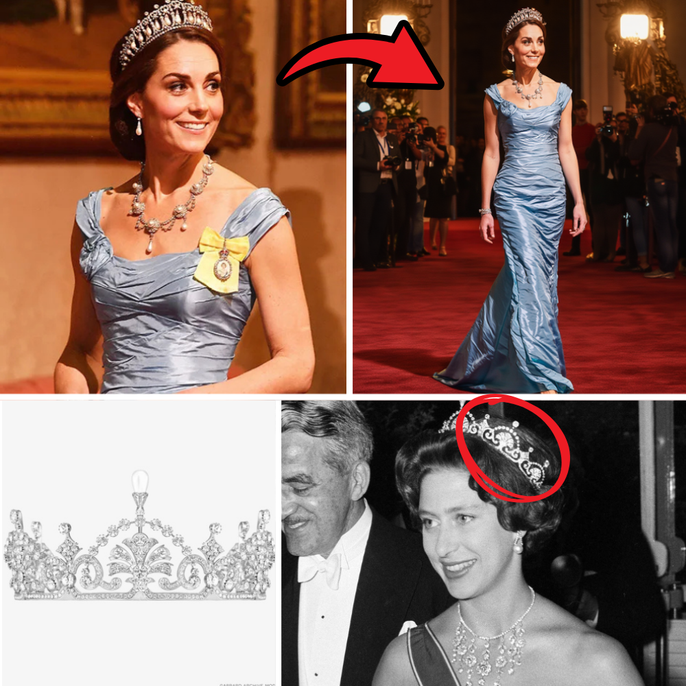 In the opulent halls of Buckingham Palace, where whispers of legacy and intrigue have long echoed off gilded walls, Princess Catherine, the epitome of modern grace, made her grand entrance at a state banquet honoring international diplomats. The date was etched into the annals of royal fashion: September 2025, a crisp autumn evening that would forever be remembered not just for its splendor, but for the veiled bombshell it unleashed upon an unsuspecting world. Draped in a custom-designed ice-blue gown that shimmered like a frozen waterfall under the chandeliers’ glow, Catherine turned heads with effortless allure. The fabric, a masterful blend of silk chiffon and hand-stitched Swarovski crystals, cascaded in ethereal waves, hugging her silhouette in a way that blended timeless poise with a whisper of audacious sensuality. But it was the crowning glory – quite literally – that ignited a firestorm of speculation: the legendary Lotus Flower Tiara, a heirloom of exquisite provenance, inherited from the formidable Queen Mother herself.