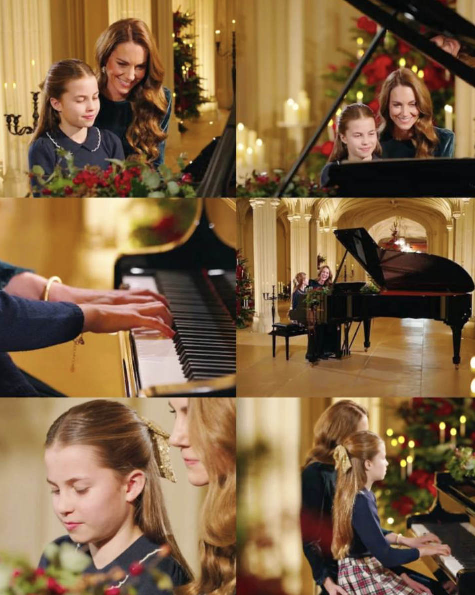What truly melted hearts worldwide was a surprise piano duet performed by Catherine and Charlotte. Pre-recorded at Windsor Castle, the pair played a gentle, festive piece titled “Holm Sound” by Scottish composer Erland Cooper—a composition inspired by nature and togetherness. Catherine used her left hand while Charlotte played the right, their smiles and focused expressions capturing a tender bond. The duet opened the televised special on Christmas Eve, accompanied by footage of the family decorating a “connection tree” outside the abbey and Catherine’s voiceover reflecting on the power of love and support.