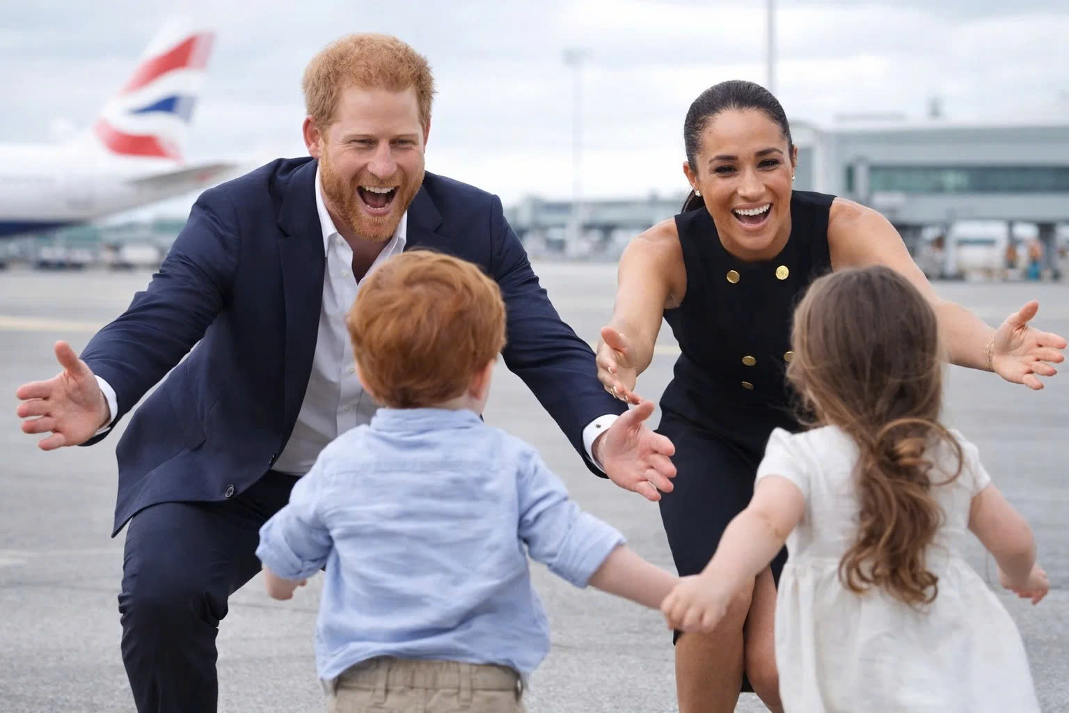 But the real magic happened the moment the plane landed. Little Archie, now six, and four-year-old Lilibet had convinced their caregivers to bring them to the airport ahead of schedule. Dressed in cozy outfits perfect for a long wait, the siblings stood hand-in-hand, eyes fixed on the arrival gate. When Harry and Meghan emerged, the children’s faces lit up with pure joy.
